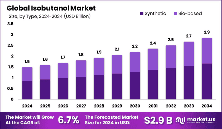 - The Global Isobutanol Market value reached USD 1.5 billion in 2024 projects to grow at a CAGR of 6.7%, reaching USD 2.9 billion by 2034.