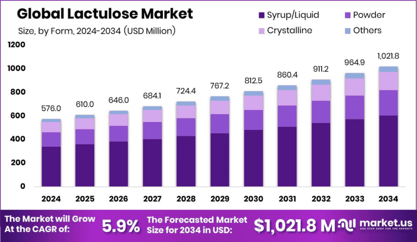 - The Global Lactulose Market will reach USD 1,021.8 million by 2034 from USD 576.0 million in 2024, growing at 5.9% CAGR.