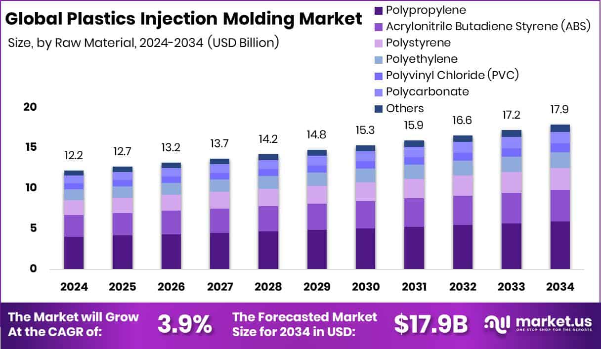 - The Global Plastics Injection Molding Market is expected to be worth around USD 17.9 billion by 2034, up from USD 12.2 billion in 2024, and is projected to grow at a CAGR of 3.9% from 2025 to 2034.
