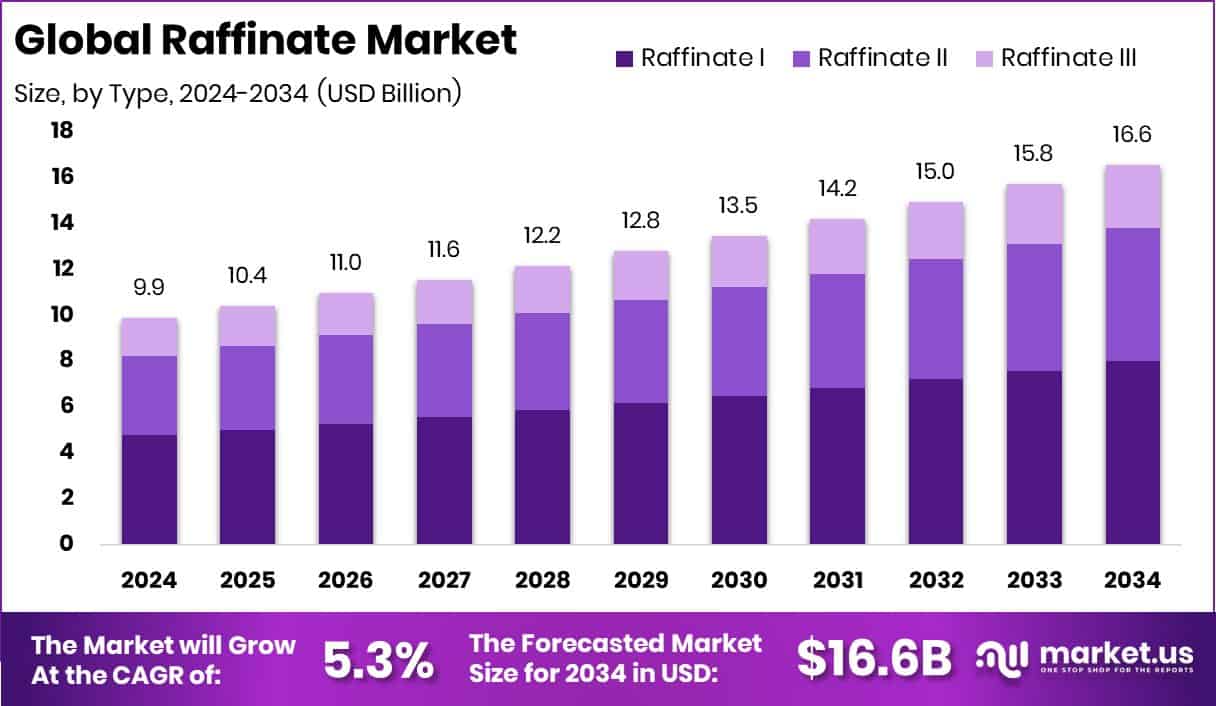 - The Global Raffinate Market is expected to be worth around USD 16.6 billion by 2034, up from USD 9.9 billion in 2024, and is projected to grow at a CAGR of 5.3% from 2025 to 2034.