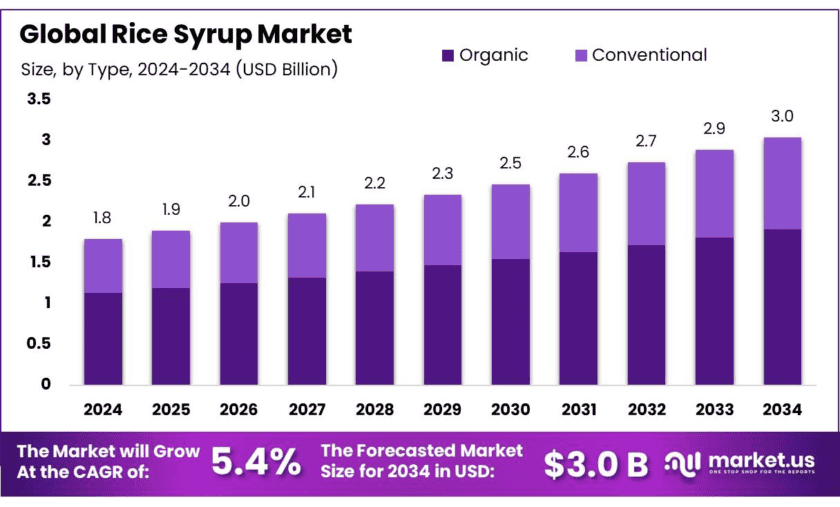 - The Rice Syrup Market size will reach USD 3.0 billion by 2034 from USD 1.8 billion in 2024 at 5.4% CAGR.