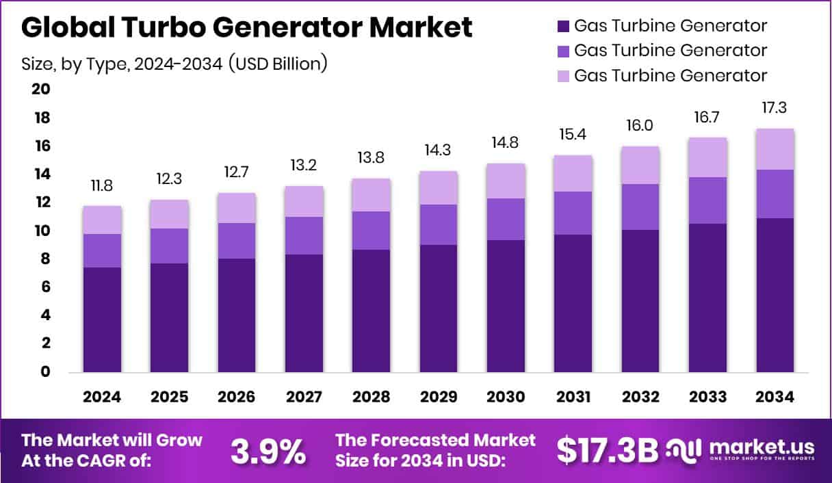 - The Global Turbo Generator Market is expected to be worth around USD 17.3 billion by 2034, up from USD 11.8 billion in 2024, and is projected to grow at a CAGR of 3.9% from 2025 to 2034.